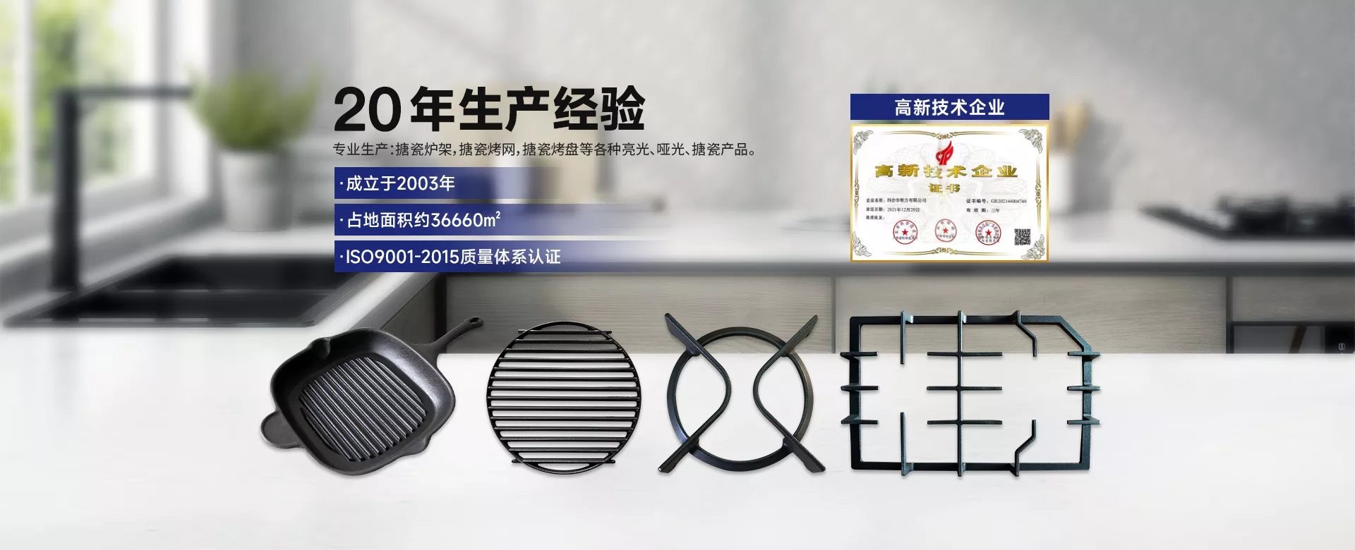 公司坚持“以科技为先导,以追求技术卓越为己任”。凭借雄厚的技术力量和开拓创新的技术管理团队,所生产的搪瓷炉架,搪瓷烤网,搪瓷烤盘等各种亮光、哑光、搪瓷产品远销欧美等国家和地区。公司所有产品符合GB/T6414-1999和GB/T11351-1989标准,公司所有烧烤类搪瓷产品均可按不同地区的食品接触要求进行测试,如法国食品安全认证DGCCRF,意大利,美国FDA,欧盟LFGB,Rohs金属六项和SVHC 219项测试等。公司宗旨是:以质优取胜,顾客至上,重合同,守信誉。在过去的19年里,我们快速成长,并在该领域取得了良好的声誉。 在今后的发展中公司将以高品质产品,高水平服务回馈国内外新老客户。